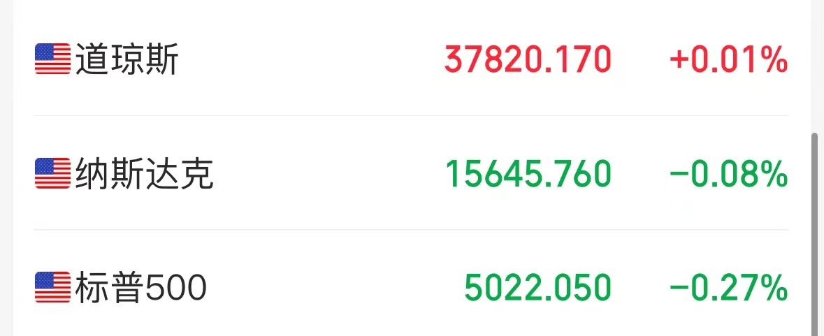 5月1日,美股三大指数开盘,道指跌0.04%,纳指跌0.07%,标普500指数跌0.1%。截至发稿,道指涨0.01%,纳指跌0.08%,标普500指数跌0.27%。